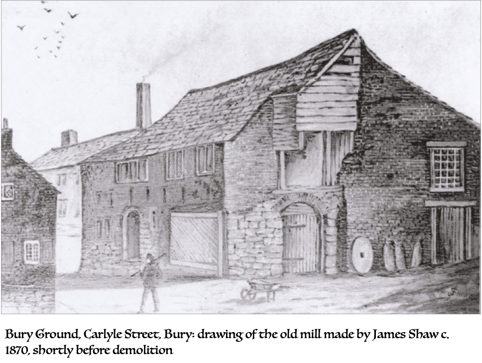 At this time, extensive lands around Bury and Tottington had been granted by the king to the Montbegone family. Roger de Montbegone gave some of his land to the knight Adam de Bury, who in turn shared it with freemen, including Roger de Noteho. Adam de Bury’s corn mill was probably sited at Bury Ground. Bury Ground almost certainly formed part of the demesne lands of the Castle, although later industrial activity has destroyed any evidence of former field boundaries and early land use. However, there is documentary evidence for the siting of a corn mill at the southern end of the site. Most medieval manors included a water powered corn mill which would have been an important source of revenue under the custom of ‘mill soke’. This meant that tenants were required to grind their corn at the lord’s mill for a fixed proportion of their grain.